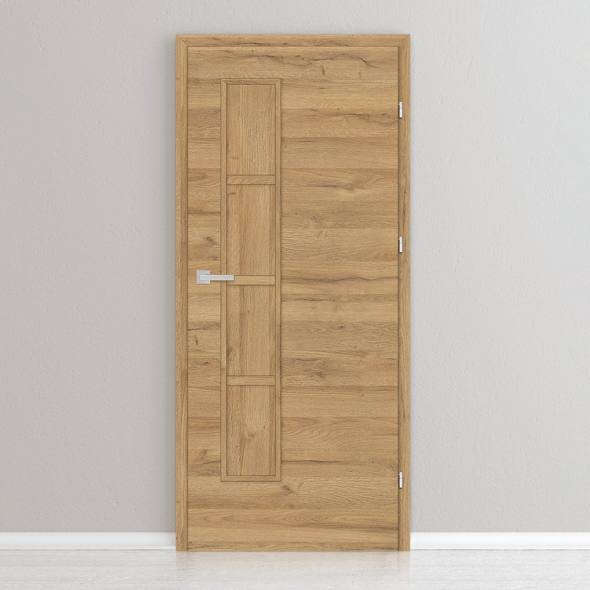 • ръб (завършване по технология стандарт или безфалцово) покрит с лента в цвета на крилото на вратата или опционално в черен цвят, гладък (в декор ДЪБ НАТЮР НАПРЕЧЕН PREMIUM черен ръбо с напречна структура)