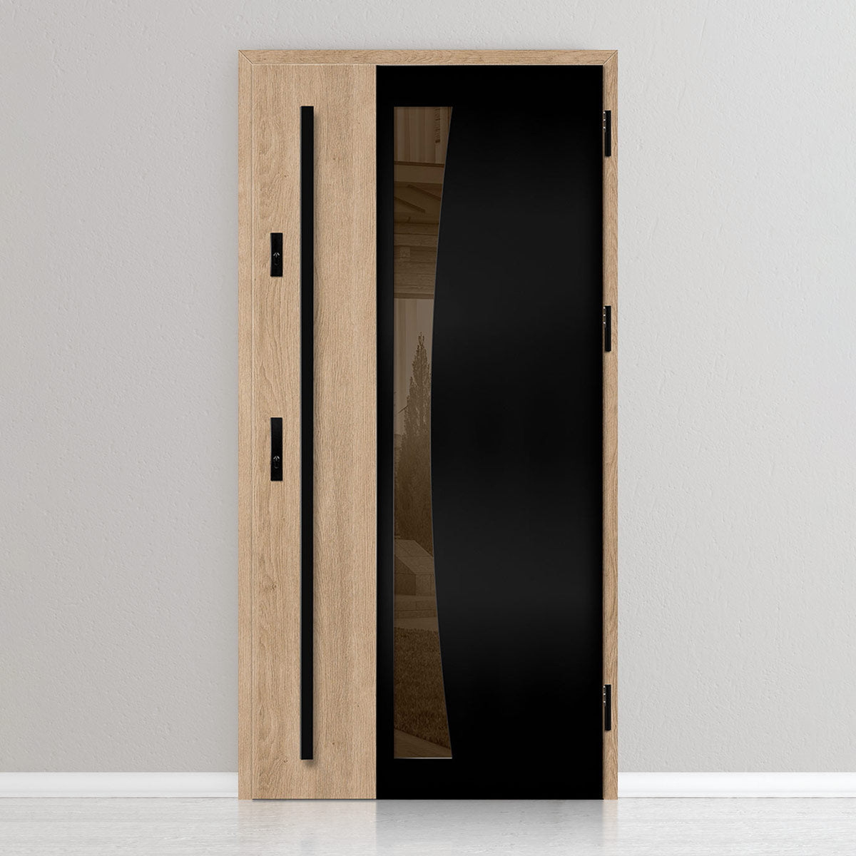 Вратата е изработена от стоманена поцинкована ламарина с дебелина 0,6мм и PVC покритие. Крилото е с пълнеж от полиуретанова пяна с плътност 750г/м3, а рамката е от лепена борова дървесина. PVC покритието се отличава с висока устойчивост на променливи атмосферни условия, UV-лъчение и механични повреди. Текстурата, адаптирана към декоративния мотив, създава продукт с висока естетическа стойност, в добавка към неговите качества за безопасност и устойчивост на взлом.