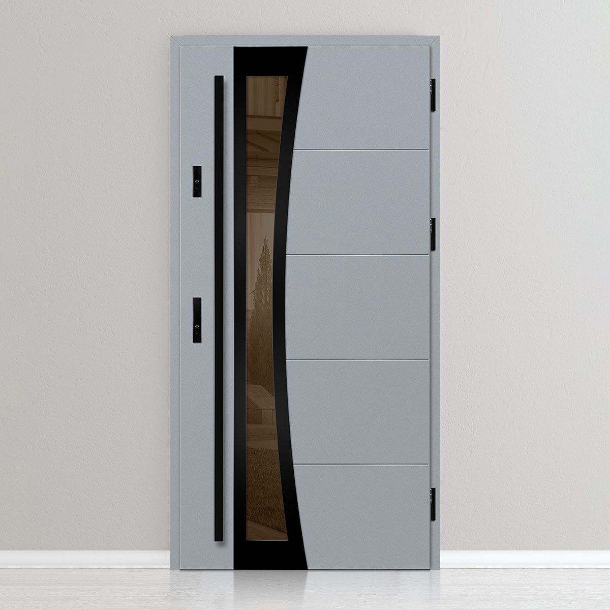 Вратата е изработена от стоманена поцинкована ламарина с дебелина 0,6мм и PVC покритие. Крилото е с пълнеж от полиуретанова пяна с плътност 750г/м3, а рамката е от лепена борова дървесина. PVC покритието се отличава с висока устойчивост на променливи атмосферни условия, UV-лъчение и механични повреди. Текстурата, адаптирана към декоративния мотив, създава продукт с висока естетическа стойност, в добавка към неговите качества за безопасност и устойчивост на взлом.