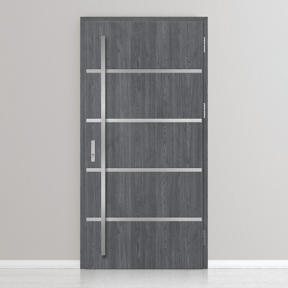 Вратата е изработена от стоманена поцинкована ламарина с дебелина 0,6мм и PVC покритие. Крилото е с пълнеж от полиуретанова пяна с плътност 750г/м3, а рамката е от лепена борова дървесина. PVC покритието се отличава с висока устойчивост на променливи атмосферни условия, UV-лъчение и механични повреди. Текстурата, адаптирана към декоративния мотив, създава продукт с висока естетическа стойност, в добавка към неговите качества за безопасност и устойчивост на взлом.