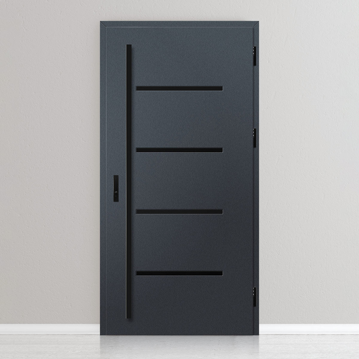 Вратата е изработена от стоманена поцинкована ламарина с дебелина 0,6мм и PVC покритие. Крилото е с пълнеж от полиуретанова пяна с плътност 750г/м3, а рамката е от лепена борова дървесина. PVC покритието се отличава с висока устойчивост на променливи атмосферни условия, UV-лъчение и механични повреди. Текстурата, адаптирана към декоративния мотив, създава продукт с висока естетическа стойност, в добавка към неговите качества за безопасност и устойчивост на взлом.