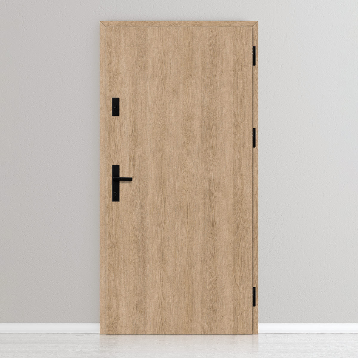 Вратата е изработена от стоманена поцинкована ламарина с дебелина 0,6мм и PVC покритие. Крилото е с пълнеж от полиуретанова пяна с плътност 750г/м3, а рамката е от лепена борова дървесина. PVC покритието се отличава с висока устойчивост на променливи атмосферни условия, UV-лъчение и механични повреди. Текстурата, адаптирана към декоративния мотив, създава продукт с висока естетическа стойност, в добавка към неговите качества за безопасност и устойчивост на взлом.