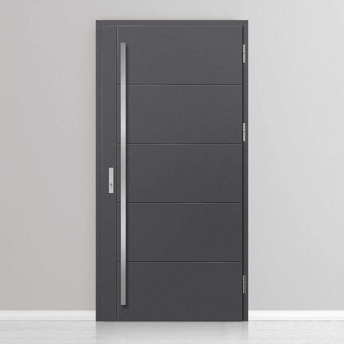 Вратата е изработена от стоманена поцинкована ламарина с дебелина 0,6мм и PVC покритие. Крилото е с пълнеж от полиуретанова пяна с плътност 750г/м3, а рамката е от лепена борова дървесина. PVC покритието се отличава с висока устойчивост на променливи атмосферни условия, UV-лъчение и механични повреди. Текстурата, адаптирана към декоративния мотив, създава продукт с висока естетическа стойност, в добавка към неговите качества за безопасност и устойчивост на взлом.
