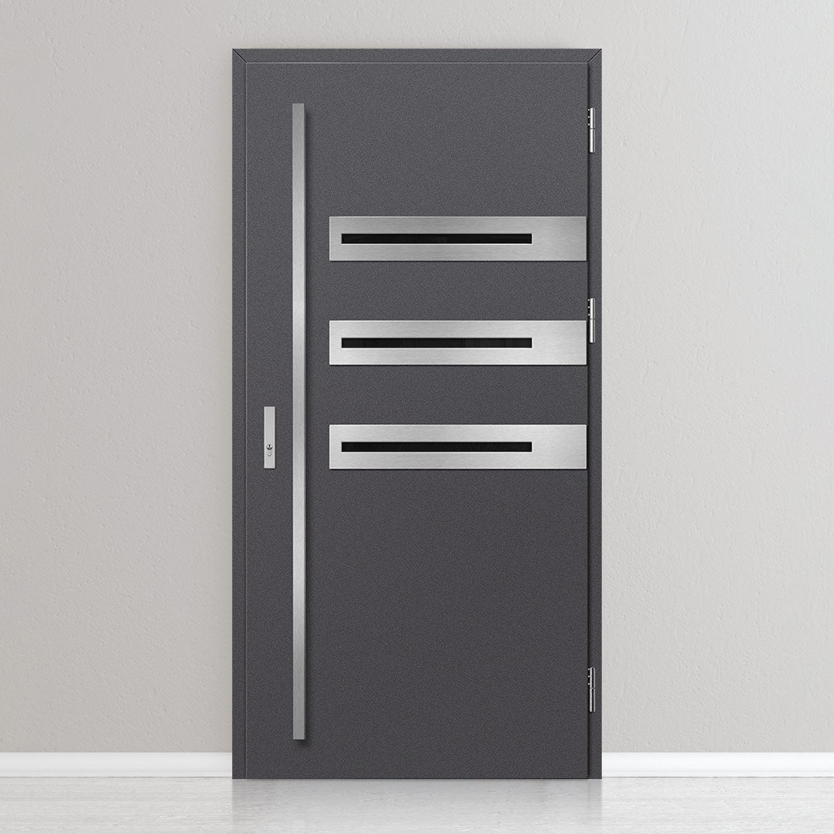 Вратата е изработена от стоманена поцинкована ламарина с дебелина 0,6мм и PVC покритие. Крилото е с пълнеж от полиуретанова пяна с плътност 750г/м3, а рамката е от лепена борова дървесина. PVC покритието се отличава с висока устойчивост на променливи атмосферни условия, UV-лъчение и механични повреди. Текстурата, адаптирана към декоративния мотив, създава продукт с висока естетическа стойност, в добавка към неговите качества за безопасност и устойчивост на взлом.