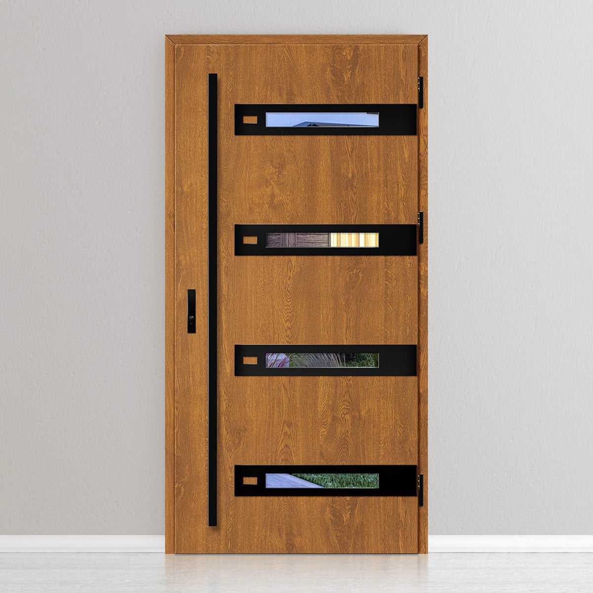 Вратата е изработена от стоманена поцинкована ламарина с дебелина 0,6мм и PVC покритие. Крилото е с пълнеж от полиуретанова пяна с плътност 750г/м3, а рамката е от лепена борова дървесина. PVC покритието се отличава с висока устойчивост на променливи атмосферни условия, UV-лъчение и механични повреди. Текстурата, адаптирана към декоративния мотив, създава продукт с висока естетическа стойност, в добавка към неговите качества за безопасност и устойчивост на взлом.