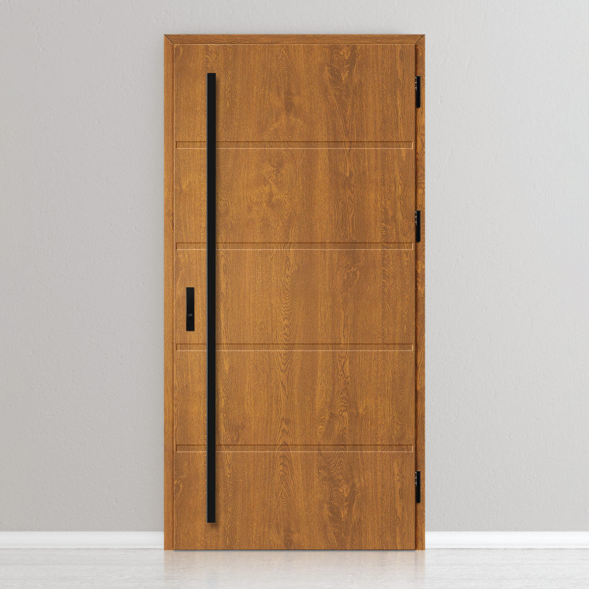 Вратата е изработена от стоманена поцинкована ламарина с дебелина 0,6мм и PVC покритие. Крилото е с пълнеж от полиуретанова пяна с плътност 750г/м3, а рамката е от лепена борова дървесина. PVC покритието се отличава с висока устойчивост на променливи атмосферни условия, UV-лъчение и механични повреди. Текстурата, адаптирана към декоративния мотив, създава продукт с висока естетическа стойност, в добавка към неговите качества за безопасност и устойчивост на взлом.
