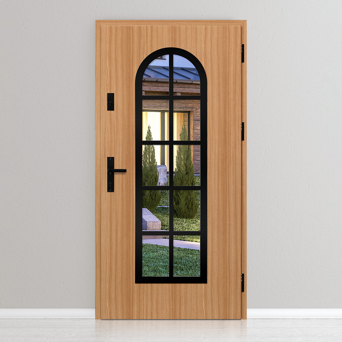 Вратата е изработена от стоманена поцинкована ламарина с дебелина 0,6мм и PVC покритие. Крилото е с пълнеж от полиуретанова пяна с плътност 750г/м3, а рамката е от лепена борова дървесина. PVC покритието се отличава с висока устойчивост на променливи атмосферни условия, UV-лъчение и механични повреди. Текстурата, адаптирана към декоративния мотив, създава продукт с висока естетическа стойност, в добавка към неговите качества за безопасност и устойчивост на взлом.
