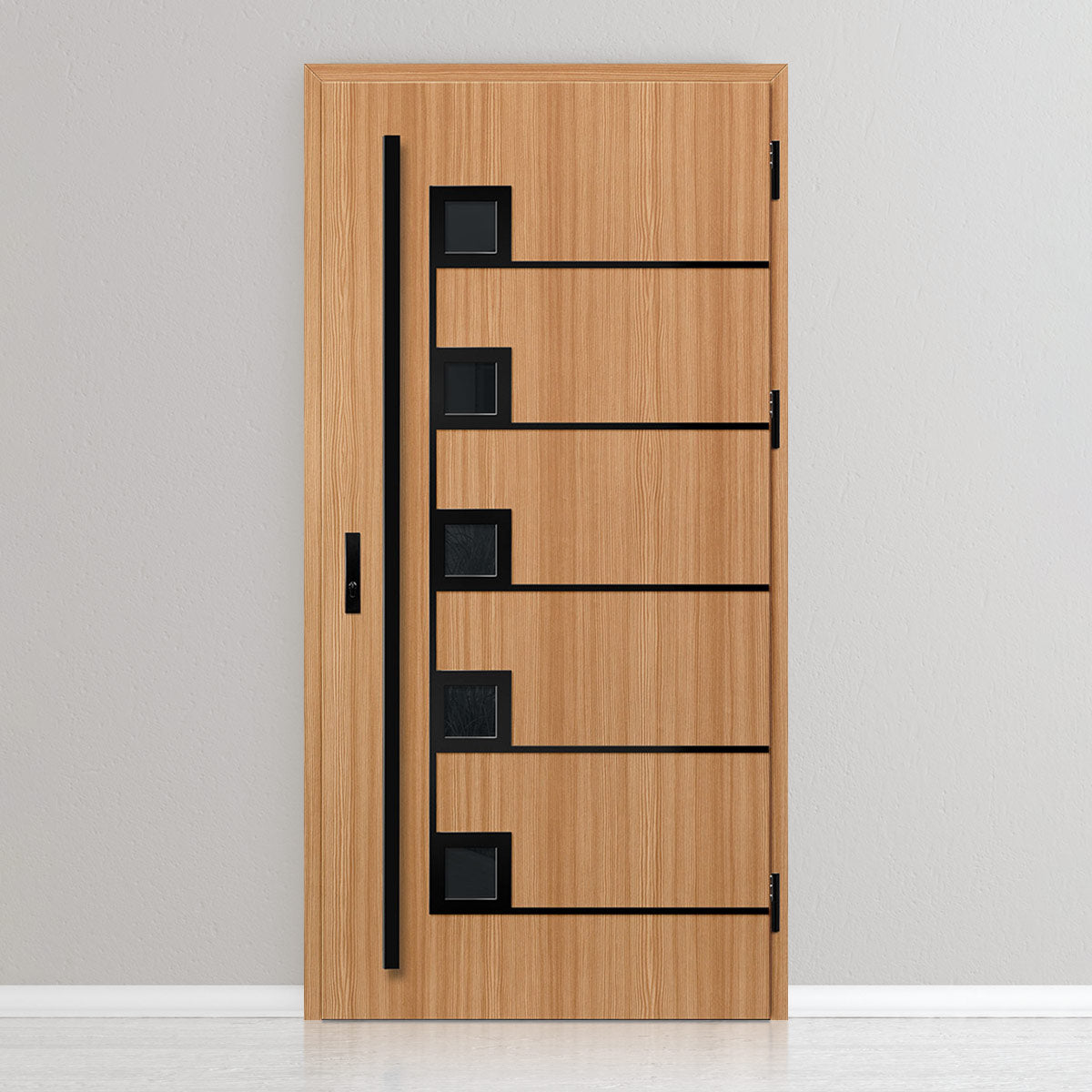 Вратата е изработена от стоманена поцинкована ламарина с дебелина 0,6мм и PVC покритие. Крилото е с пълнеж от полиуретанова пяна с плътност 750г/м3, а рамката е от лепена борова дървесина. PVC покритието се отличава с висока устойчивост на променливи атмосферни условия, UV-лъчение и механични повреди. Текстурата, адаптирана към декоративния мотив, създава продукт с висока естетическа стойност, в добавка към неговите качества за безопасност и устойчивост на взлом.
