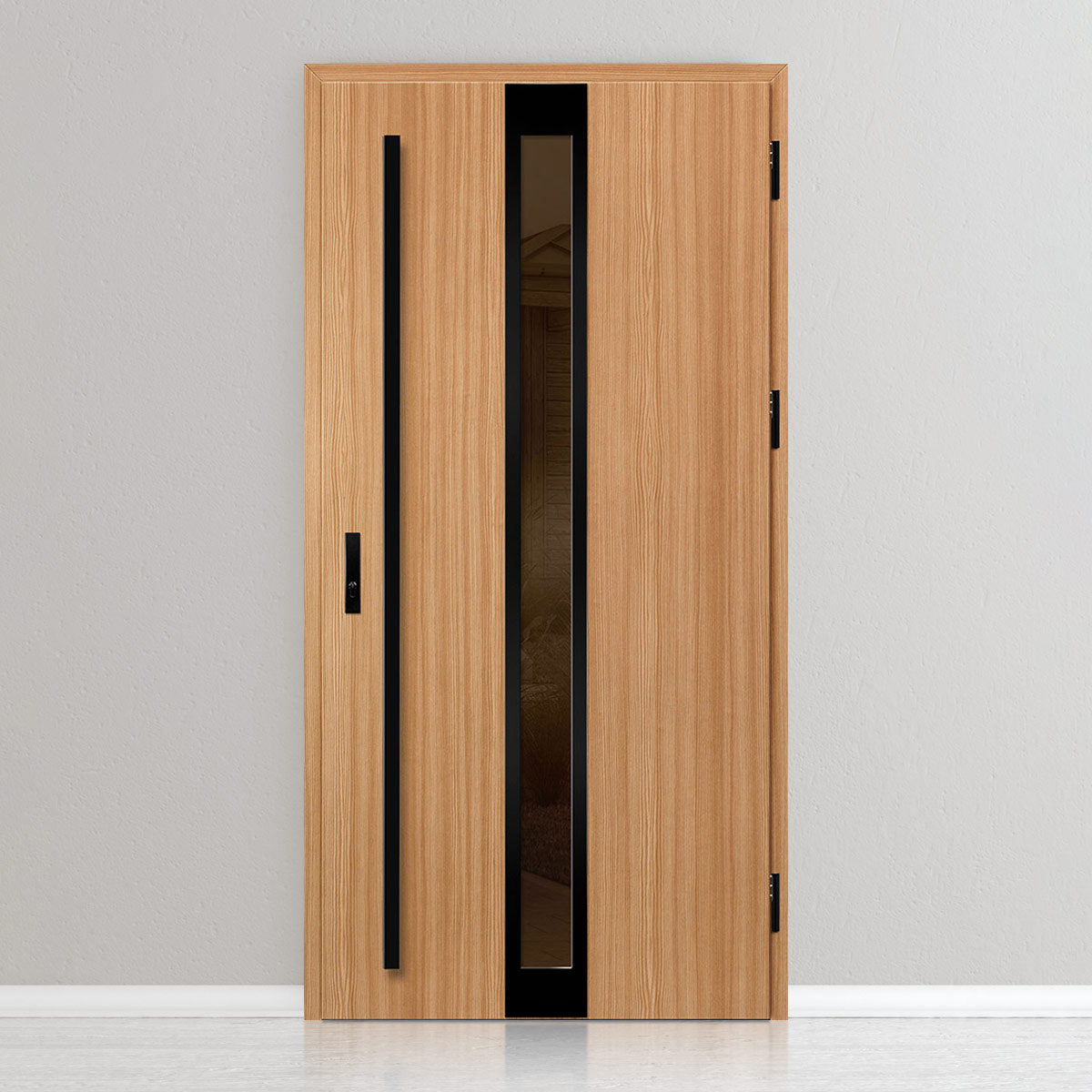 Вратата е изработена от стоманена поцинкована ламарина с дебелина 0,6мм и PVC покритие. Крилото е с пълнеж от полиуретанова пяна с плътност 750г/м3, а рамката е от лепена борова дървесина. PVC покритието се отличава с висока устойчивост на променливи атмосферни условия, UV-лъчение и механични повреди. Текстурата, адаптирана към декоративния мотив, създава продукт с висока естетическа стойност, в добавка към неговите качества за безопасност и устойчивост на взлом.