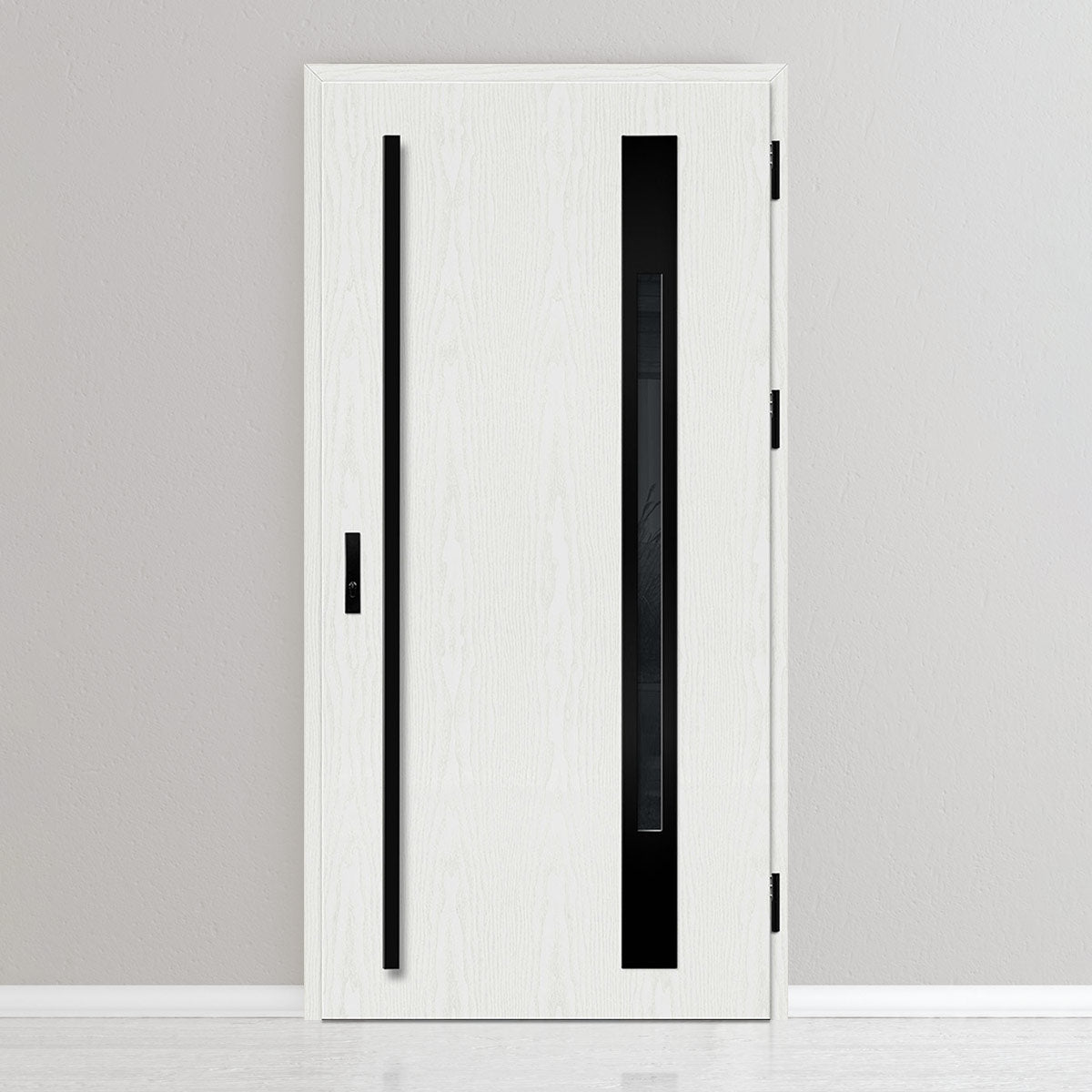 Вратата е изработена от стоманена поцинкована ламарина с дебелина 0,6мм и PVC покритие. Крилото е с пълнеж от полиуретанова пяна с плътност 750г/м3, а рамката е от лепена борова дървесина. PVC покритието се отличава с висока устойчивост на променливи атмосферни условия, UV-лъчение и механични повреди. Текстурата, адаптирана към декоративния мотив, създава продукт с висока естетическа стойност, в добавка към неговите качества за безопасност и устойчивост на взлом.