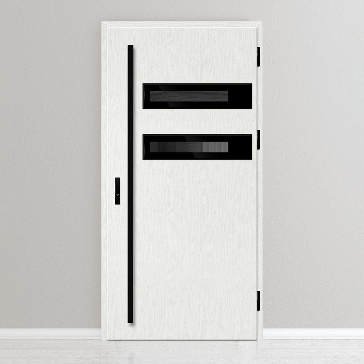 Вратата е изработена от стоманена поцинкована ламарина с дебелина 0,6мм и PVC покритие. Крилото е с пълнеж от полиуретанова пяна с плътност 750г/м3, а рамката е от лепена борова дървесина. PVC покритието се отличава с висока устойчивост на променливи атмосферни условия, UV-лъчение и механични повреди. Текстурата, адаптирана към декоративния мотив, създава продукт с висока естетическа стойност, в добавка към неговите качества за безопасност и устойчивост на взлом.