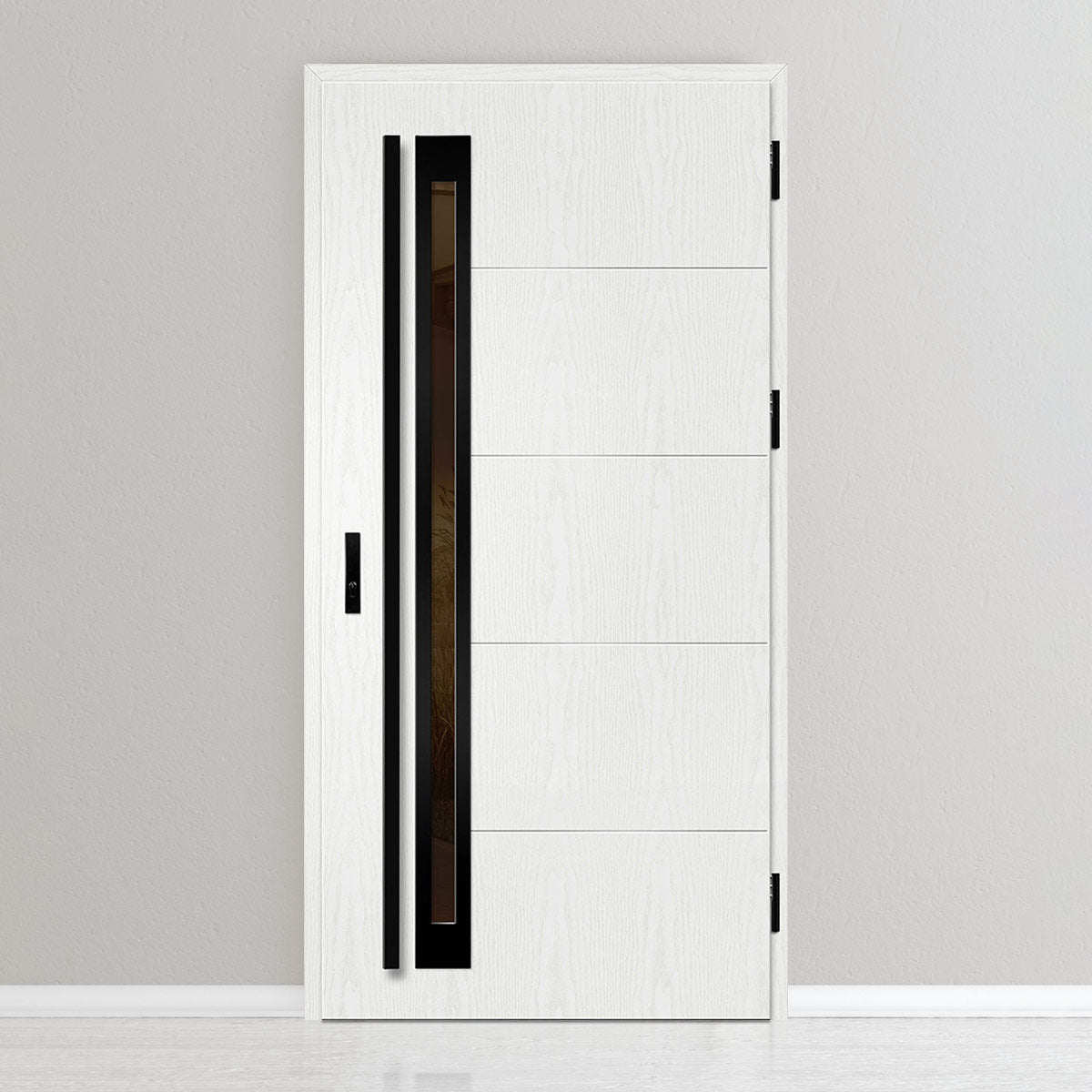 Вратата е изработена от стоманена поцинкована ламарина с дебелина 0,6мм и PVC покритие. Крилото е с пълнеж от полиуретанова пяна с плътност 750г/м3, а рамката е от лепена борова дървесина. PVC покритието се отличава с висока устойчивост на променливи атмосферни условия, UV-лъчение и механични повреди. Текстурата, адаптирана към декоративния мотив, създава продукт с висока естетическа стойност, в добавка към неговите качества за безопасност и устойчивост на взлом.