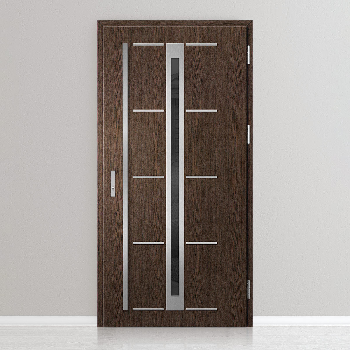 Вратата е изработена от стоманена поцинкована ламарина с дебелина 0,6мм и PVC покритие. Крилото е с пълнеж от полиуретанова пяна с плътност 750г/м3, а рамката е от лепена борова дървесина. PVC покритието се отличава с висока устойчивост на променливи атмосферни условия, UV-лъчение и механични повреди. Текстурата, адаптирана към декоративния мотив, създава продукт с висока естетическа стойност, в добавка към неговите качества за безопасност и устойчивост на взлом.