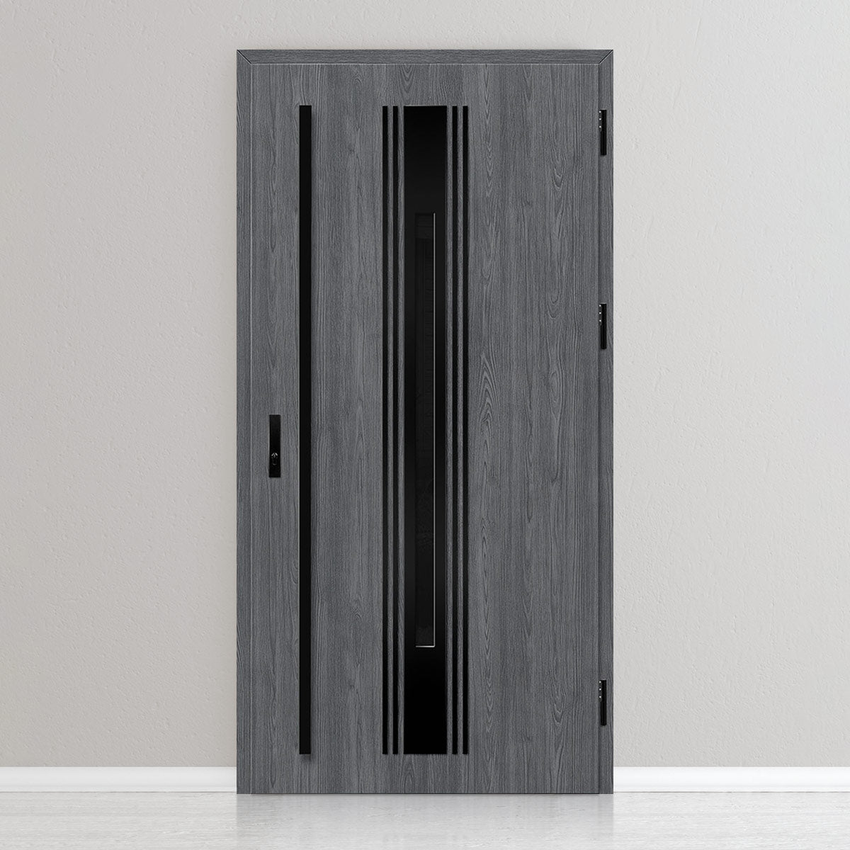 Вратата е изработена от стоманена поцинкована ламарина с дебелина 0,6мм и PVC покритие. Крилото е с пълнеж от полиуретанова пяна с плътност 750г/м3, а рамката е от лепена борова дървесина. PVC покритието се отличава с висока устойчивост на променливи атмосферни условия, UV-лъчение и механични повреди. Текстурата, адаптирана към декоративния мотив, създава продукт с висока естетическа стойност, в добавка към неговите качества за безопасност и устойчивост на взлом.